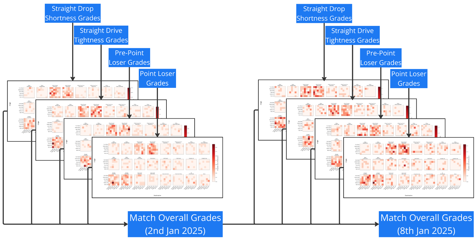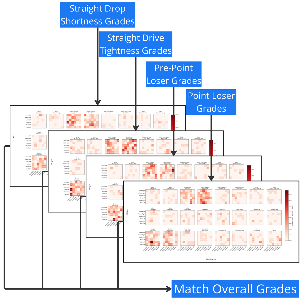 But this still isn't the full picture... You might consistently play a poor Volley Straight Drop from the Middle-Right to the Front-Right in one match and the grade for this shot would be poor across many features (points lost, tightness, shortness etc.) but that shot could have typically been your best shot. It’s just in this one match that your opponent forced errors out of you or some other reason caused you to play this shot poorly.